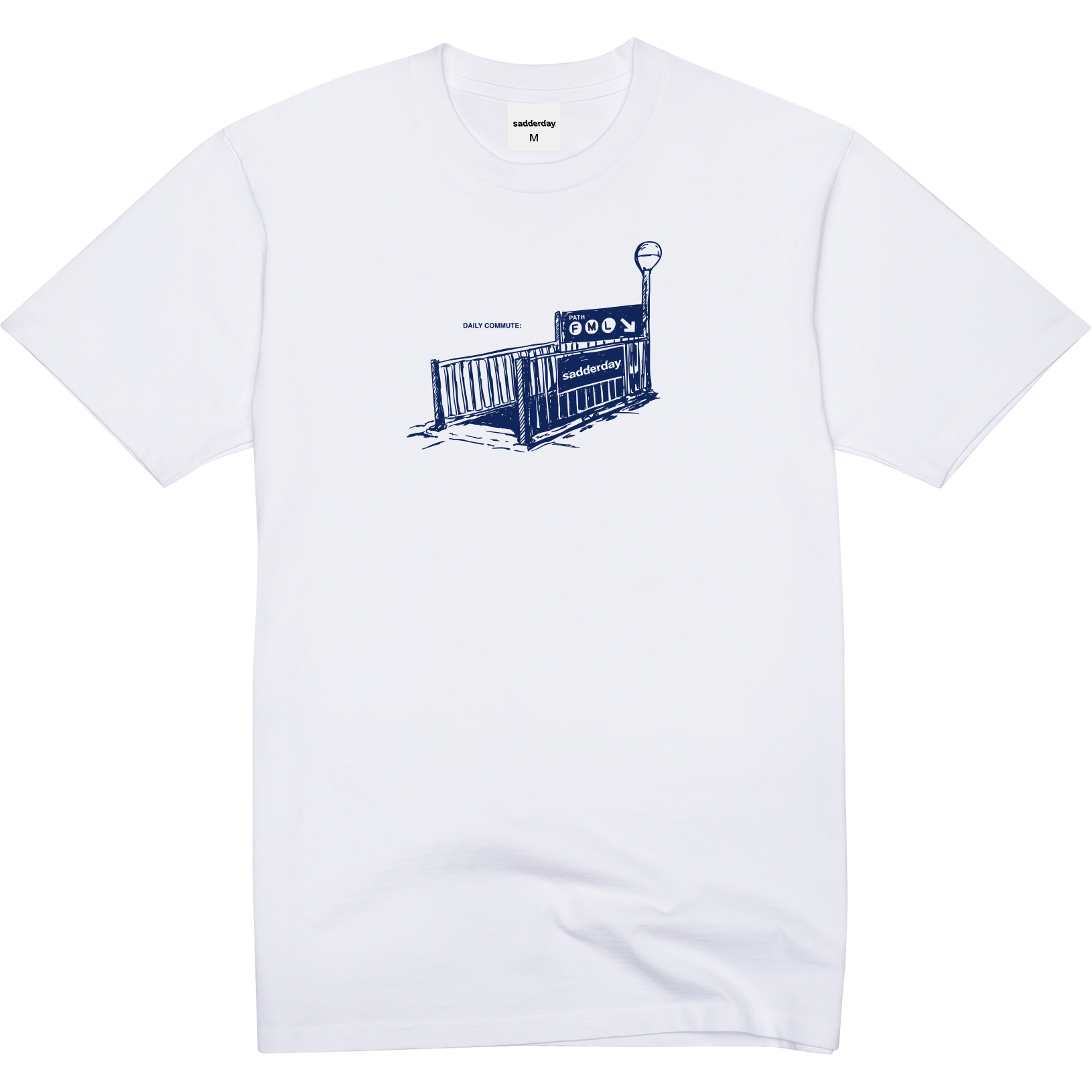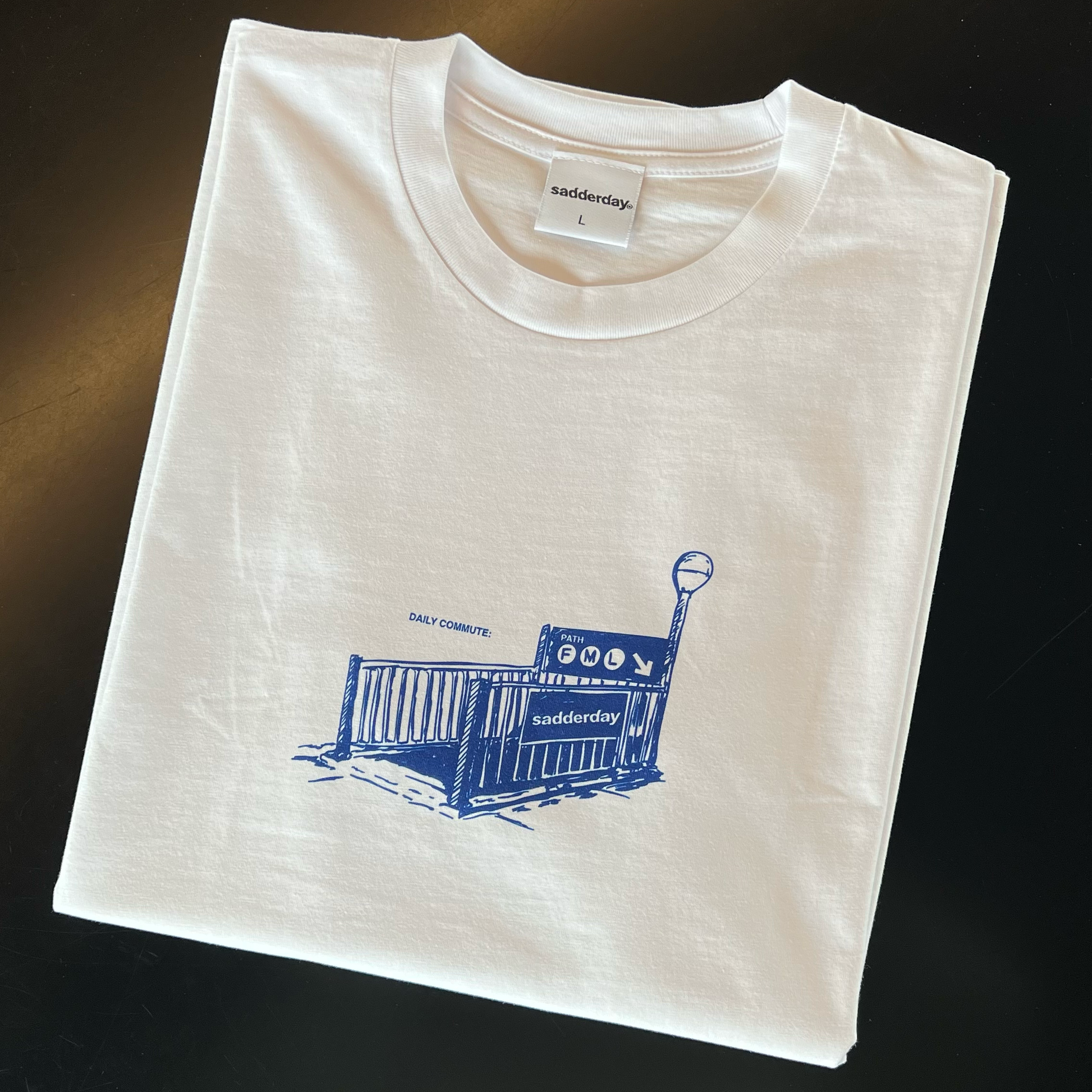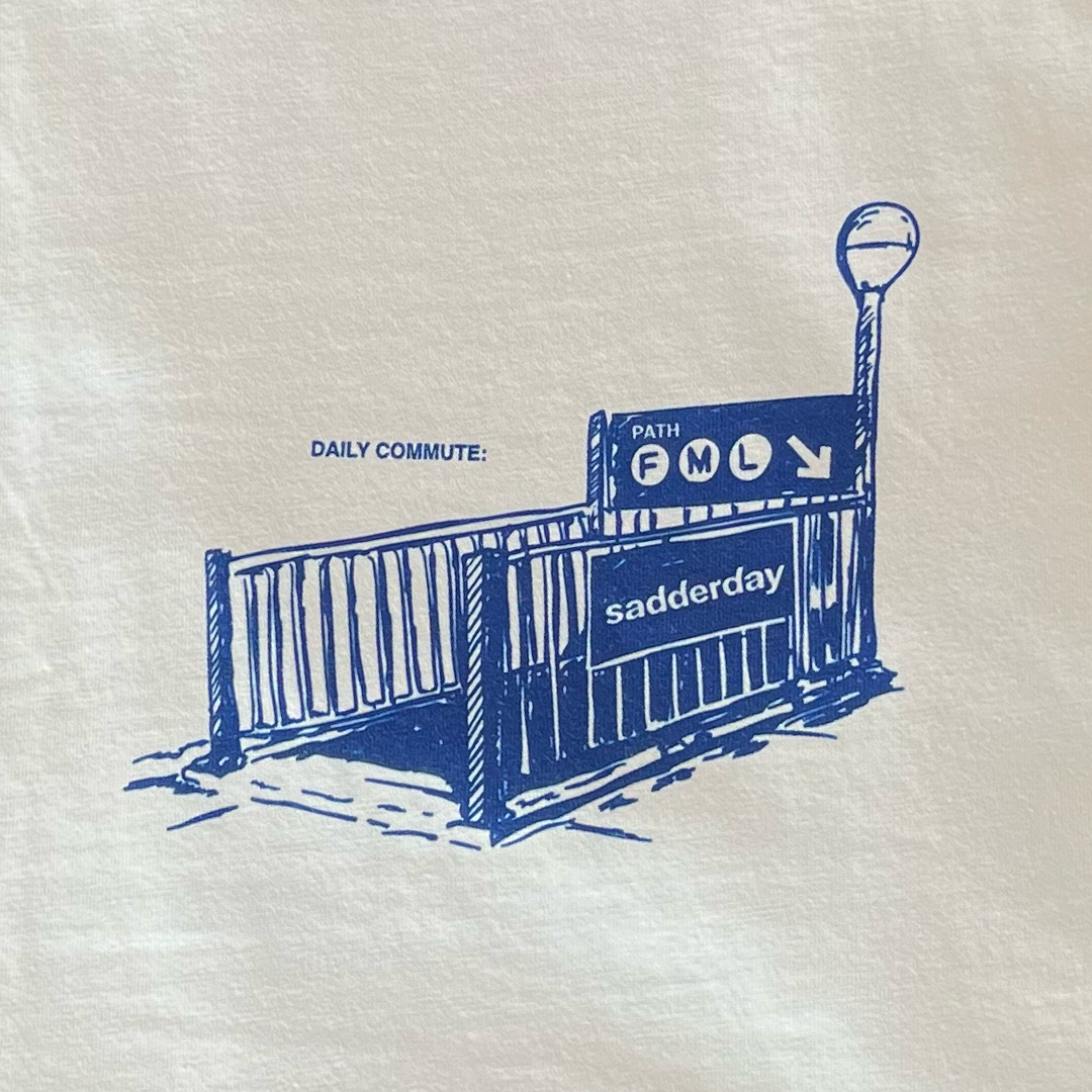 Screenprinted daily commute x FML subway station on front.